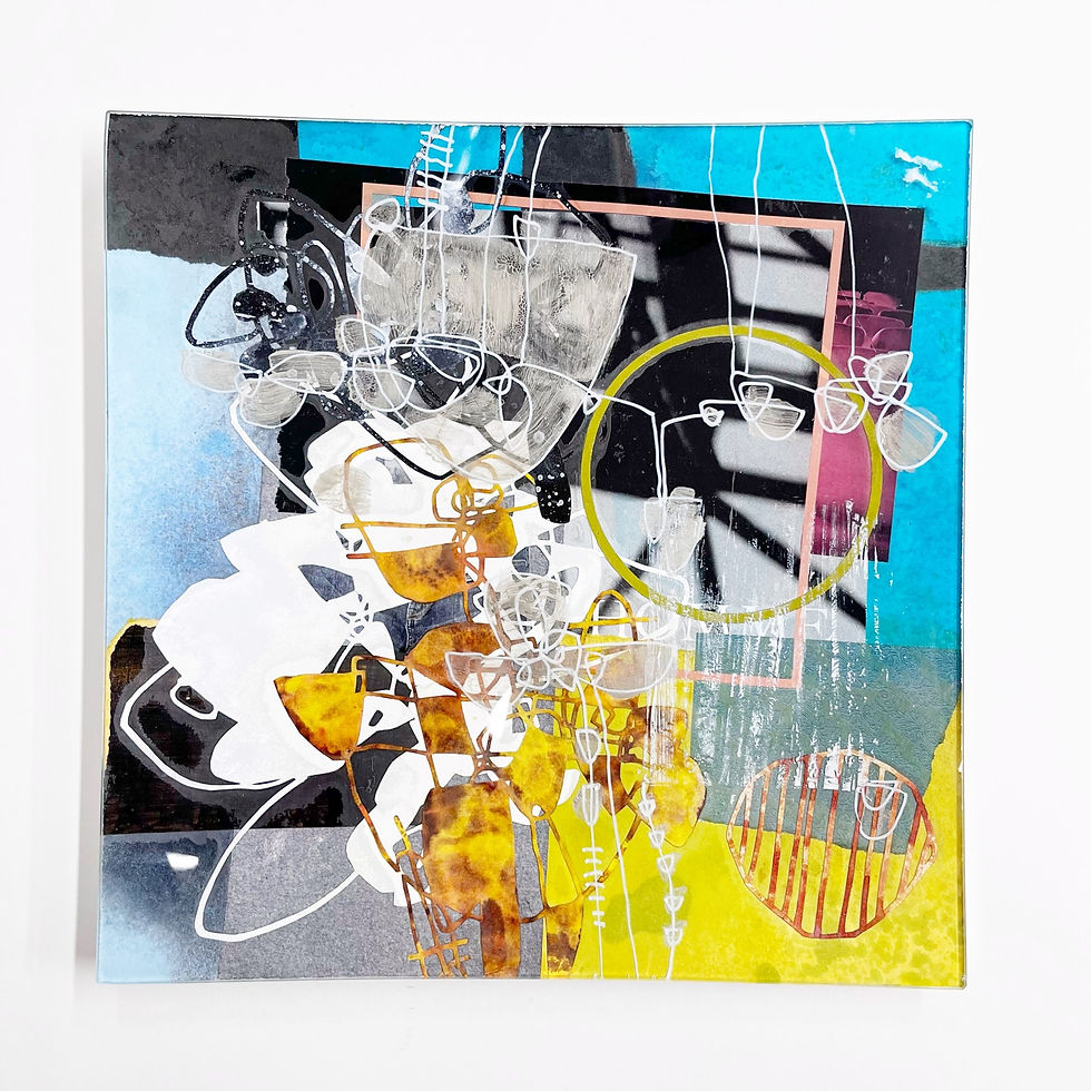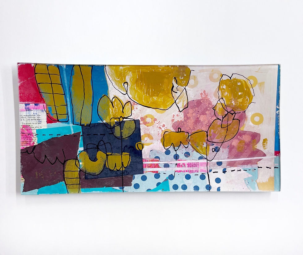 Using a decoupage technique, handmade and recycled papers, plant materials, fibre, dried pigment, metallics and dyes are combined to transform functional glass into unique works of art.